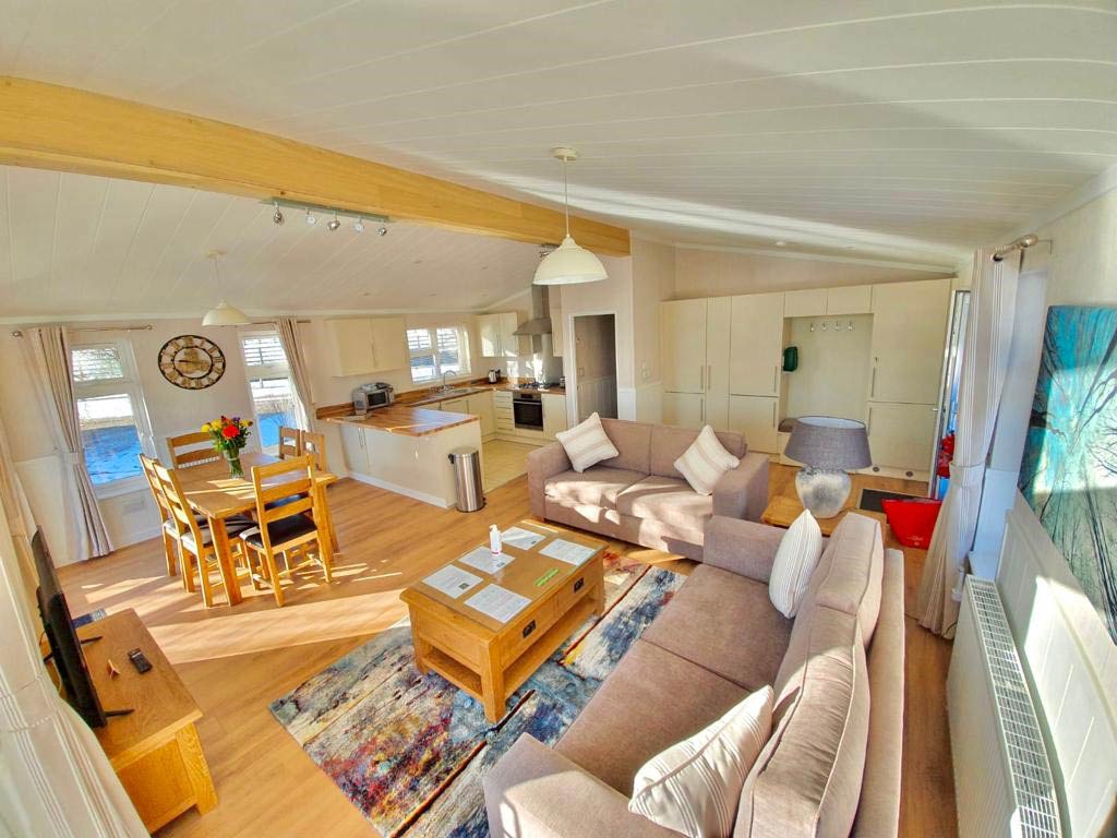 Luxurious and bespoke lodge, ideal for a family or couples retreat. Two king-size doubles, one with en suite shower and one twin. . Spacious open plan lounge/kitchen/dining area with French doors leading to verandah with outdoor hot tub and outdoor furniture boasting blissful lakeside views. On-site Parking