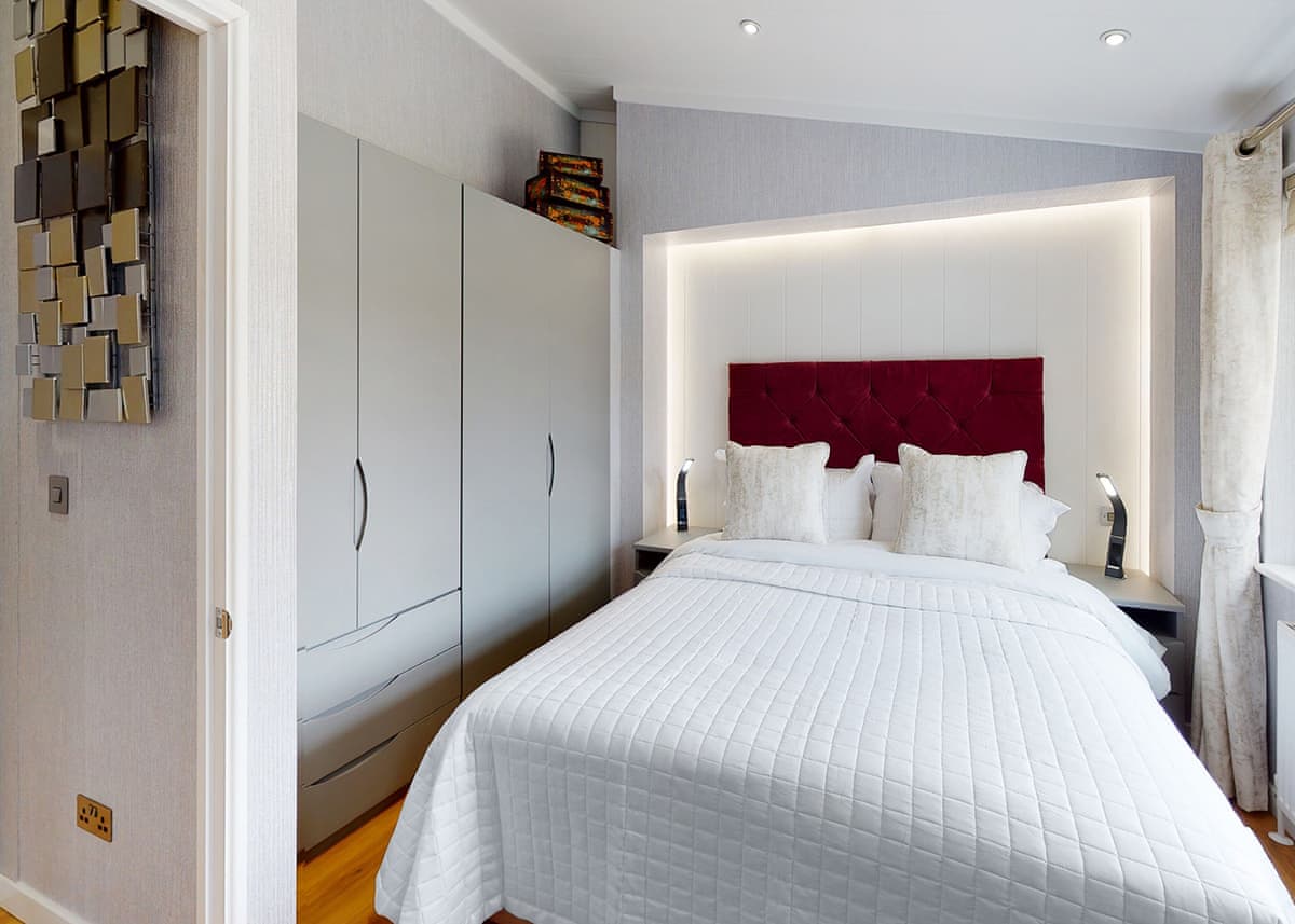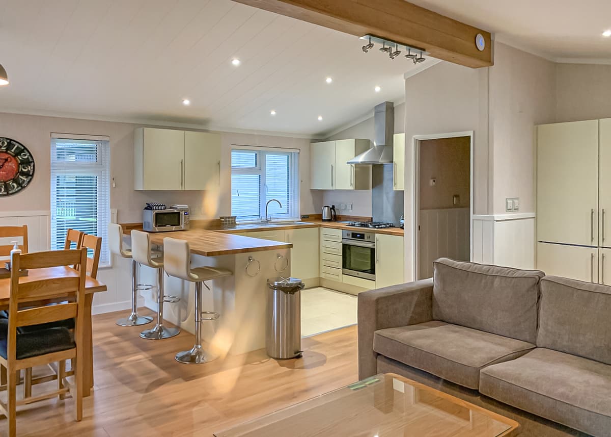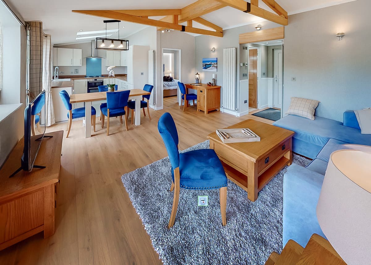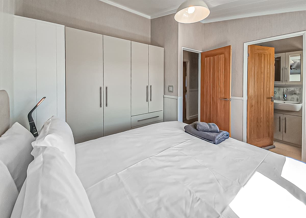 Kite Deluxe Lodge. This modern two-bedroom lodge features a master double bedroom (with king-size bed) comprising a luxury en suite complete with twin basin, underfloor heating and dressing area. The guest bedroom also with a king-size bed has access to the family bathroom which is fully tiled with a shower over bath and underfloor heating.