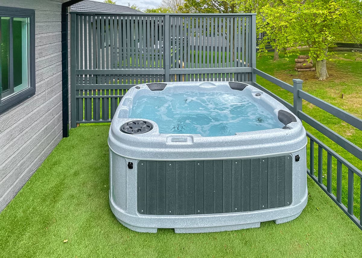 The spacious open-plan living/dining area/kitchen gives access to two pairs of French doors leading to the verandah with views over the lake, a private hot tub and space for outside dining. The kitchen is fitted with a 5-burner gas hob, double oven, wine fridge, fridge freezer, and dishwasher. There is a utility room just off the entrance lobby with ample storage, sink and washing machine. The lodge is complete with parking for two vehicles.