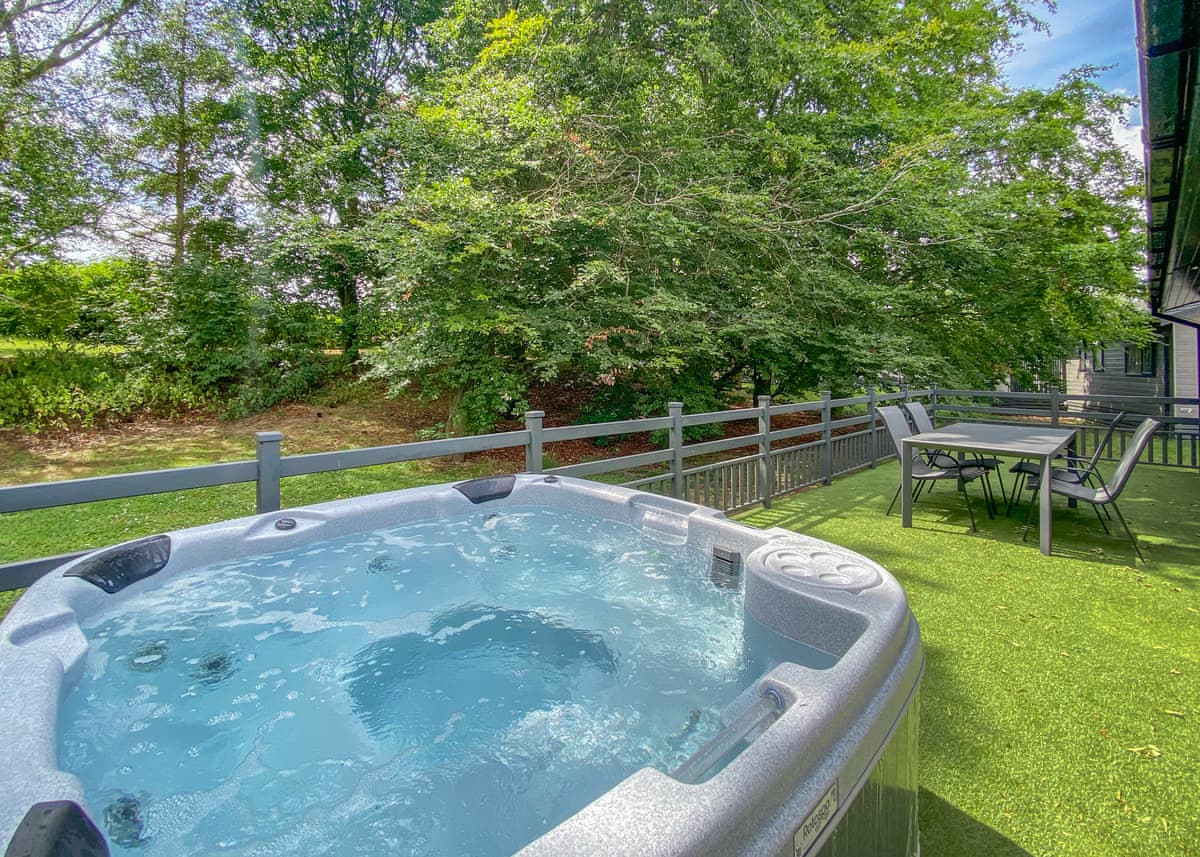 Amazing secluded lodge with 2 king-size double bedrooms, one with en suite shower, and one twin bedroom. Shared bathroom with shower over bath. Spacious open plan lounge/kitchen/dining area with breakfast bar and French doors leading to wrap around deck with raised outdoor hot tub and outdoor furniture enjoying a woodland setting. On-site parking.
